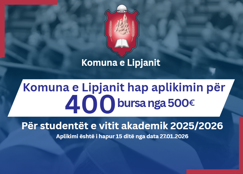 Komuna e Lipjanit shpall konkurs për ndarjen e 400 bursave për studentët për vitin akademik 2025/2026, në vlerë prej 500 euro për secilin përfitues.