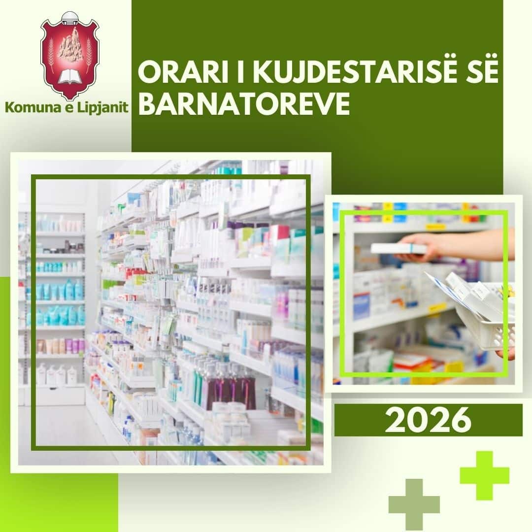 Komuna e Lipjanit ju njofton se është përcaktuar orari i kujdestarisë së barnatoreve për muajin janar 2026. Po ashtu këtij njoftimi i është bashkëngjitur edhe orari i kujdestarisë së barnatoreve për ditët e dielave për gjashtë muajt në vijim.