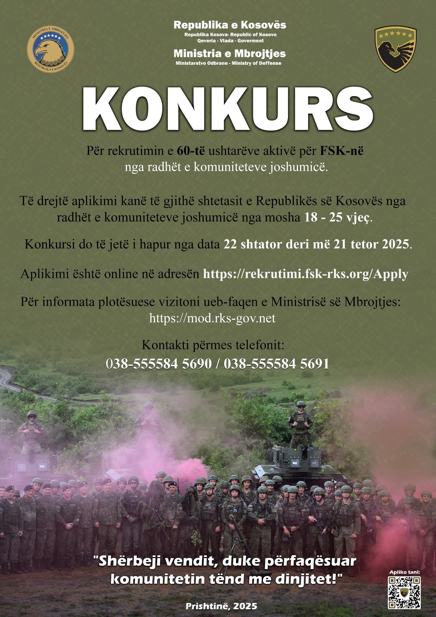 Njoftim lidhur me konkursin për rekrutimin e 60-të ushtarëve aktivë për FSK-në nga radhët e komuniteteve joshumicë